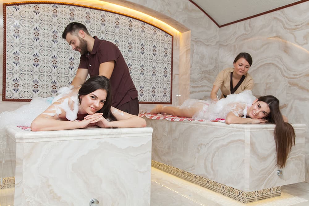 Помещение одновременно сочетает в себе возможности влажного (хаммам) и сухого парения (расул) в зависимости от пожеланий клиента. Массивные каменные столы, нагреваясь, создают идеальные условия для проведения сеансов расслабляющего массажа и обертываний.